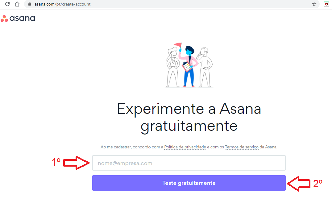 1. Crie sua conta acessando https://asana.com/pt/create-account . Você deverá visualizar a seguinte tela: