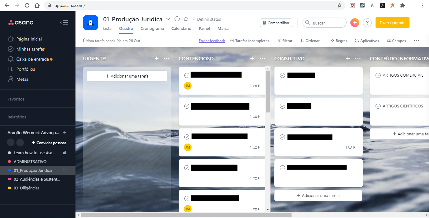 O Asana é o sistema online de gerenciamento de atividades diárias do escritório. É onde registramos todos os trabalhos relacionados à produção jurídica (contencioso processual e consultivo) e rotinas administrativas.