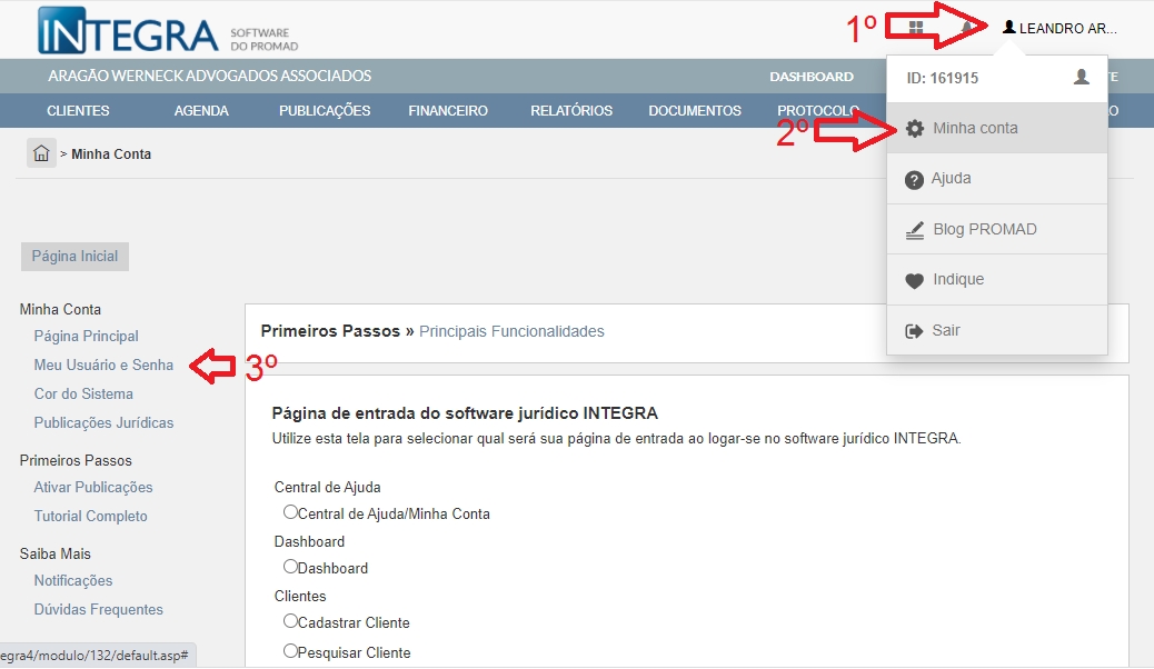 3. Se este é o seu primeiro acesso, promova imediatamente a troca da sua senha de acesso. Basta acessar o menu clicando no seu nome de usuário (canto superior direito) e, em seguida, nas opções indicadas abaixo: