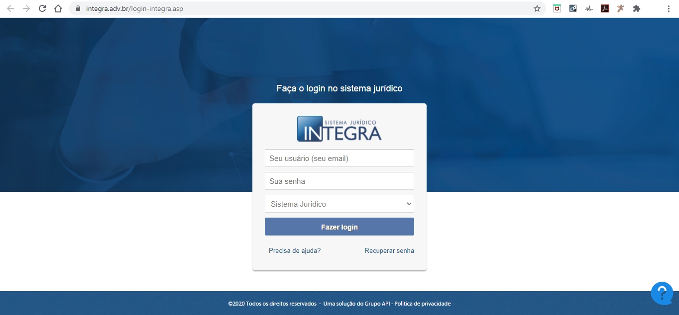1. Acesse https://integra.adv.br/login-integra.asp . Você deverá visualizar a seguinte tela: