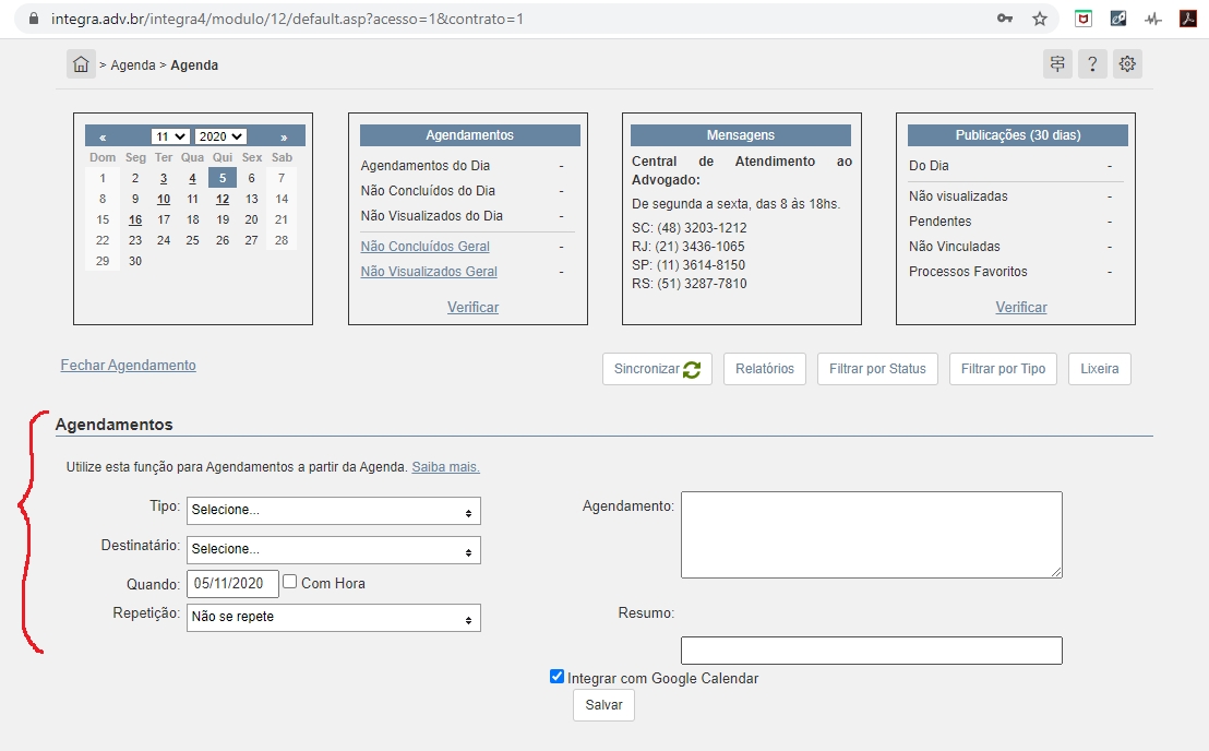 Crie um agendamento (instruções de preenchimento: nome, contato e tipo SEDE / VIDEOCONF / IN LOCO ; além de data e hora)